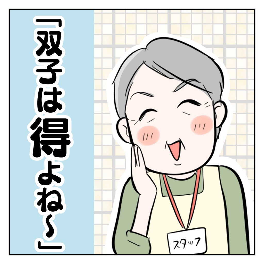 「双子は楽よ(年子よりも楽よの意)」というおばさんにはよく声をかけられましたが、「双子は得よ」と言われたのは初めてでした。