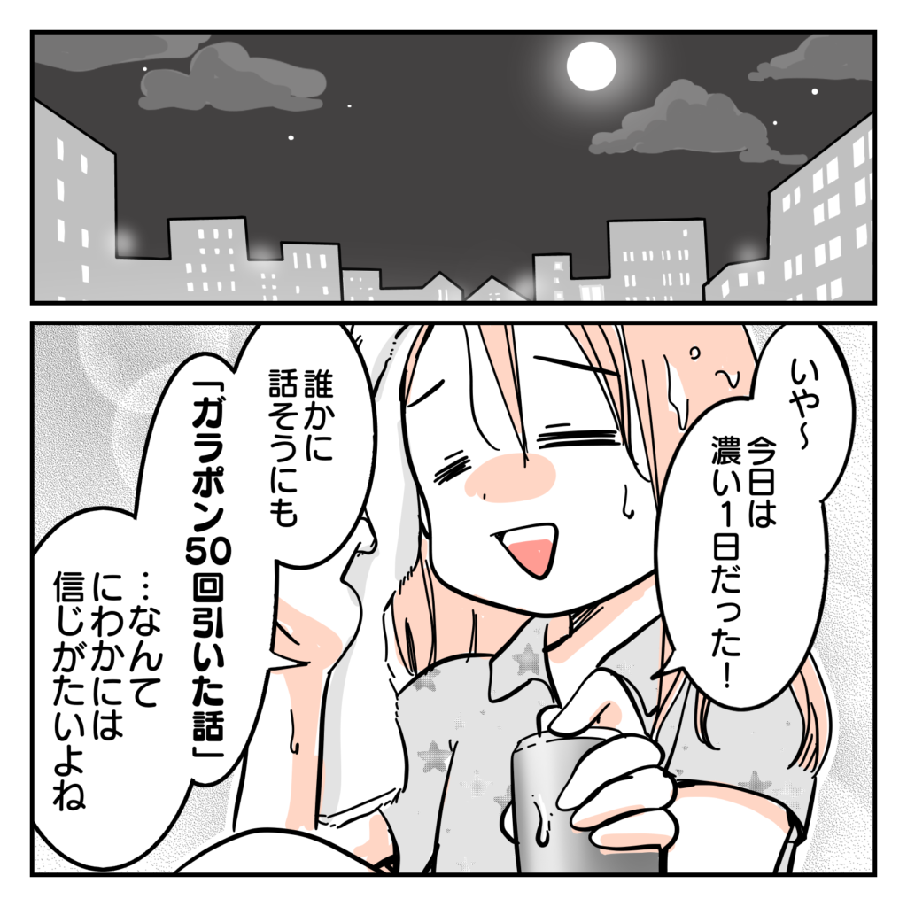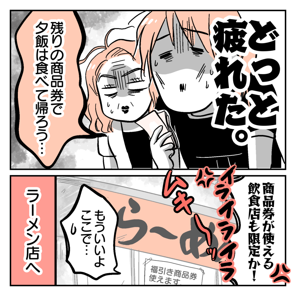 この日、2時間歩き回って新居に必要なものを購入し、重たい荷物を持ってガラポンを50回引くイベントをこなし、ほぼHPゼロの我々親娘はこの商品券の使い道をめぐって一触即発、険悪な雰囲気になってしまったのでした。(งಠ皿ಠ)ง