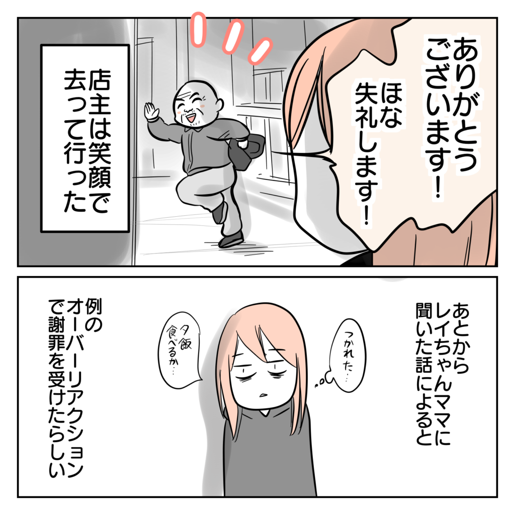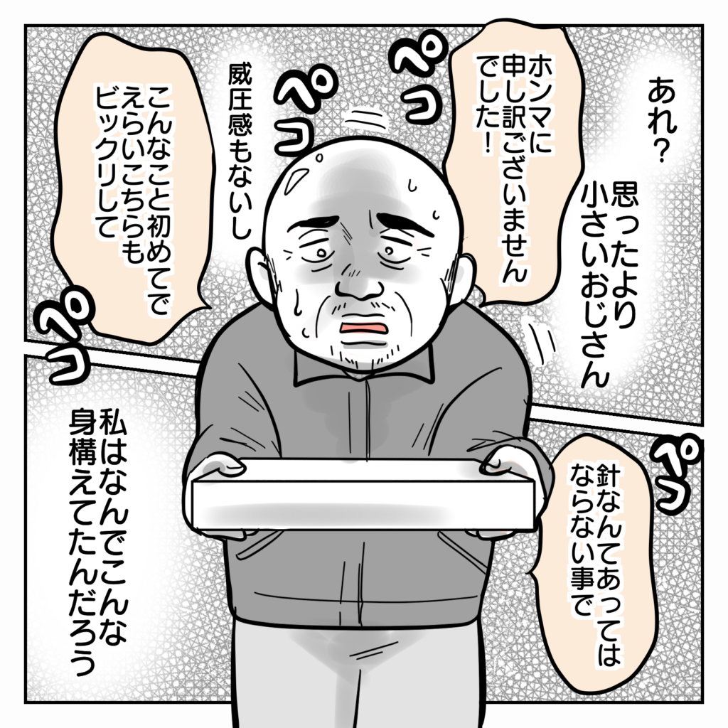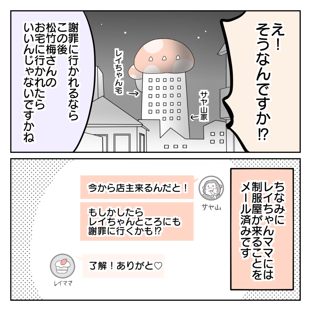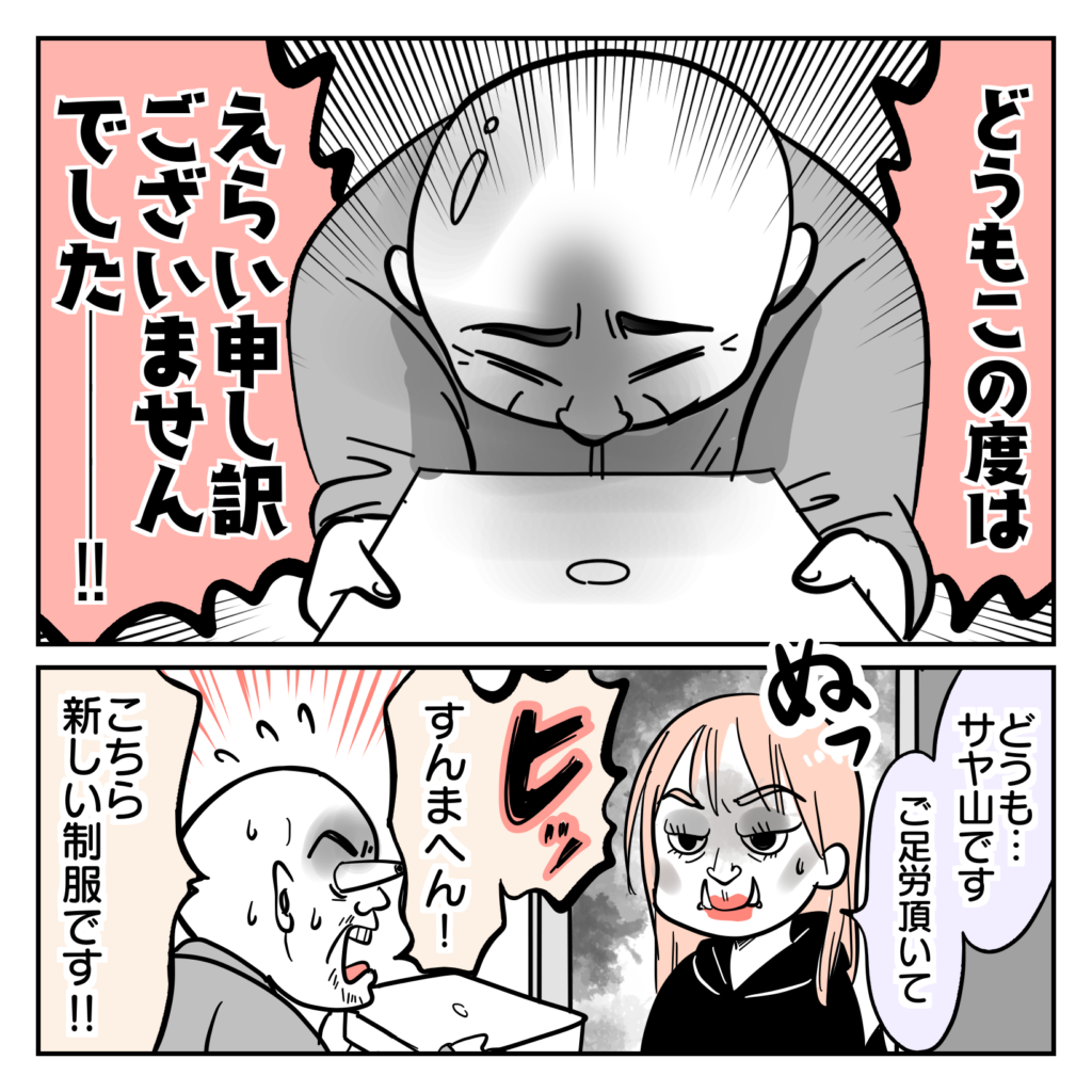 2023年07月19日 制服にマチ針が混入してた話⑬ 🌟続きはこちら 🌟第1話はこちら ※この漫画は実体験をもとに、登場人物や場所にフィクションを加えて描いています。 ついに店主登場!! 見た目はあまり似せないように描きましたが、オーバーリアクションなところはそのままです。電話で話した印象より小柄で、始終申し訳なさそうに汗をかいていました。申し訳ないという気持ちは本当でしょうけれど、どこか自分可愛さがチラリチンチラ…(´_ゝ`) 🌟続きはこちら